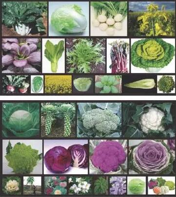 蕓薹屬包括三個(gè)二倍體物種:蕓薹(Brassica rapa)、黑芥(B. nigra)和甘藍(lán)(B. oleracea),這三個(gè)基本種經(jīng)過(guò)兩兩雜交又產(chǎn)生了四倍體的歐洲油菜(B. napus)、非洲油菜(B. carinata)和芥菜(B. juncea),這就是“禹氏三角”。隨著人工馴化和持續(xù)的育種工作,這些物種產(chǎn)生了高度多樣化的形態(tài)型,例如結(jié)成球狀的葉片、膨大的塊莖(或根 部、頂芽、腋芽等)。有意思的是,某些物種的形態(tài)型,盡管是在不同的地區(qū)獨(dú)立培育而成,但卻表現(xiàn)出相似的表型特征,這便是趨同馴化的結(jié)果。