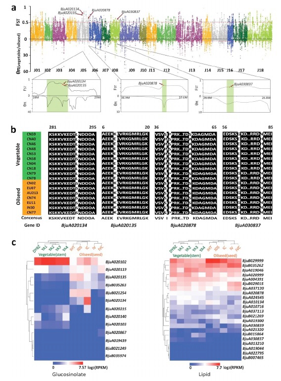 通過菜用和油用芥菜群體進(jìn)行選擇清除分析,發(fā)現(xiàn)dominance的基因被篩選出來的比例較高,同時結(jié)合轉(zhuǎn)錄組數(shù)據(jù),這部分基因在油用和菜用兩個群體中差 異表達(dá)。同時通過上面的分析發(fā)現(xiàn)與硫苷,脂類代謝顯著相關(guān)并且存在dominance的基因組,這些基因在油用菜用群體中有各自獨特基因分型。