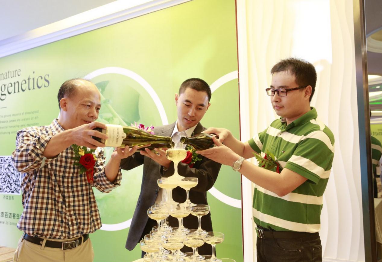 會(huì)中,眾嘉賓同時(shí)為發(fā)布會(huì)揭幕,迎來全場嘉賓們的矚目及掌聲,制作精美的大型雜志模型浮現(xiàn),同時(shí)芥菜基因組數(shù)據(jù)全球同步發(fā)布。接下來中國農(nóng)科院王曉武教 授、百邁客鄭洪坤總裁、浙江大學(xué)楊景華教授一起澆注香檳塔。于軍老師等嘉賓隨后一同舉杯,共同祝賀蕓薹屬科研成果的發(fā)布。會(huì)上有二十幾家媒體到場,媒體提 問環(huán)節(jié)也十分引人注目,cctv4、科技日報(bào)提出了百姓關(guān)注的餐桌問題;測序中國、生物探索、生物谷行業(yè)媒體就兩篇論文的基因組發(fā)布技術(shù)和潛在的應(yīng)用前景 與嘉賓進(jìn)行探討,嘉賓們紛紛做了精彩的回答。