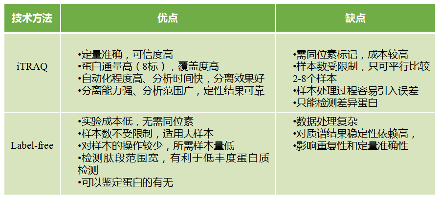 以質(zhì)譜為基礎(chǔ)的定量蛋白質(zhì)組學(xué),主要可以分成兩類,第一種是穩(wěn)定同位素標記的定量蛋白質(zhì)組學(xué),比如iTRAQ;第二種是非標記的定量蛋白質(zhì)組學(xué)技術(shù),比如label-free。iTRAQ定性定量結(jié)果更為準確,通量較高可同時標記2-8個樣本,但是對樣本數(shù)有一定限制且不適用于低豐度蛋白的定量,適合小樣本量的項目;label-free檢測肽段范圍廣,單次可鑒定和定量較多的蛋白質(zhì),但由于樣品單獨進行質(zhì)譜檢測所以重現(xiàn)性較低,在大量算法的基礎(chǔ)上更適合大量樣本的蛋白組研究。