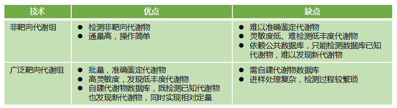 非靶向代謝組和廣靶代謝組是目前代謝組學(xué)常用的技術(shù)。非靶向代謝組是將對照組和實驗組樣本的全部代謝物進行比對,以找出其代謝物的差異。廣靶代謝組是高通量、高靈敏度靶向代謝物檢測技術(shù),提供了定性、定量檢測大批量、低豐度代謝物高效的方法, 有助于全面解析差異代謝物與代謝途徑。