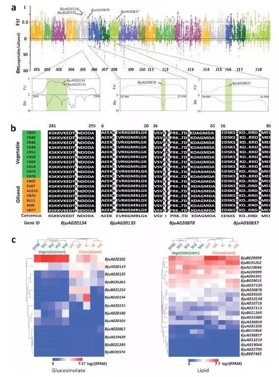 通過(guò)菜用和油用芥菜群體進(jìn)行選擇清除分析,發(fā)現(xiàn)dominance的基因被篩選出來(lái)的比例較高,同時(shí)結(jié)合轉(zhuǎn)錄組數(shù)據(jù),這部分基因在油用和菜用兩個(gè)群體中差異表達(dá)。同時(shí)通過(guò)上面的分析發(fā)現(xiàn)與硫苷,脂類代謝顯著相關(guān)并且存在dominance的基因組,這些基因在油用菜用群體中有各自獨(dú)特基因分型。