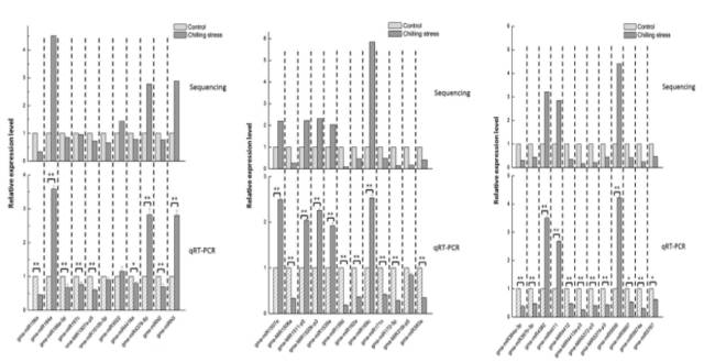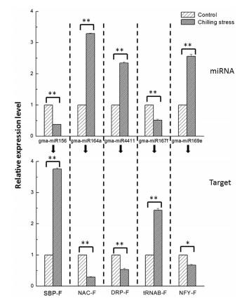 對相應(yīng)靶基因進行功能注釋來研究差異表達的miRNA可能行使的功能。差異表達的miRNA可以分為四類。第一類包括miRNA家族(miR156、miR164、miR169、miR4412和miR5327),靶基因為轉(zhuǎn)錄因子SBP、NAC、NFY、GRAS和bHLH,參與調(diào)控基因表達和信號傳導(dǎo)。第二類包括miR4411,其對應(yīng)靶基因涉及抵御疾病。第三類包括miR5761、miR159、miR5667、miR1535、miR511、miR4382和miR4416,其對應(yīng)靶基因參與植物生長發(fā)育中的適應(yīng)性。為了進一步確認冷脅迫下miRNA和靶基因的關(guān)系,選擇了5個miRNAs及其靶基因進行qRT-PCR驗證。結(jié)果表明,在冷脅迫下miRNA-164a,miRNA-4411和miRNA-169e上調(diào)。相反的,他們的靶基因NAC、DRP和NFY顯著下調(diào)。說明miRNA和對應(yīng)靶基因呈負相關(guān)性。