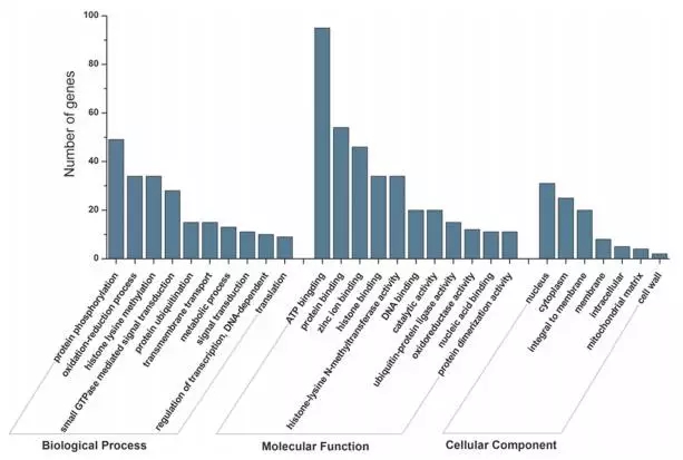 為了近一步確認這些差異表達miRNA的功能,對靶基因進行GO分析。靶基因共參與了56個分子功能terms,37個生物學(xué)過程terms和7個細胞組分terms。在分子功能分類下,ATP結(jié)合、蛋白結(jié)合、組蛋白結(jié)合等terms是顯著富集的。超過35%miRNAs的靶基因參與了生物學(xué)過程途徑。
