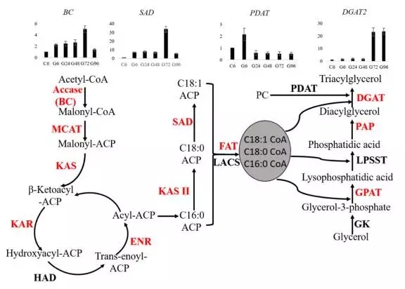 藻類和植物中脂肪酸的生物合成主要在葉綠體中進(jìn)行。乙酰-CoA作為合成的起始物質(zhì)?;谵D(zhuǎn)錄組測序,小球藻質(zhì)體中脂肪酸合成基因被鑒定到。在葡萄糖處理情況下,這些基因大都表達(dá)量上調(diào)。另外這次測序結(jié)果中還發(fā)現(xiàn)幾個(gè)基因?qū)?yīng)的不同轉(zhuǎn)錄本。由于BC和SAD是脂肪酸合成的限速酶基因,做了進(jìn)一步分析,發(fā)現(xiàn)BC和SAD表達(dá)量從6h到72h表達(dá)量持續(xù)上升,對應(yīng)的三酰甘油含量從24h到96h持續(xù)增加。