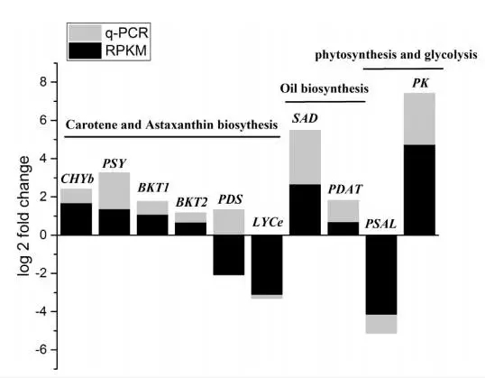 作者選了10個(gè)與蝦青素和三酰甘油合成有關(guān)的unigenes進(jìn)行了RT-PCR驗(yàn)證,其中9個(gè)基因的表達(dá)趨勢與RNA-seq結(jié)果一致。只有PDS兩種結(jié)果不同,可能是RNA-seq結(jié)果不準(zhǔn)確,因?yàn)榍叭说难芯砍晒?,葡萄糖是上調(diào)PDS表達(dá)的,與本文中RT-PCR結(jié)果一致。