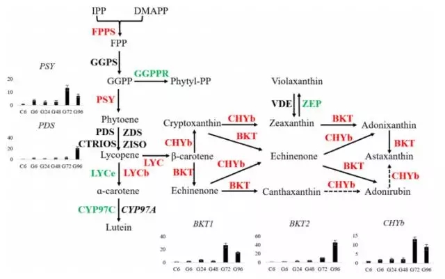 在轉(zhuǎn)錄組測序結(jié)果中,發(fā)現(xiàn)MEP通路中的8個(gè)基因都被鑒定到,但是在MVA通路中只有2個(gè)基因被檢測到,其中HMG表達(dá)不顯著,ACAT表達(dá)量下降。這些結(jié)果表明小球藻中蝦青素的合成通路中IPP和DMAPP是MEP通路合成的。其中,發(fā)現(xiàn)一個(gè)可能編碼β-胡蘿卜素激酶(BKT2)與數(shù)據(jù)庫中的BKT1比對率僅為56%。功能分析發(fā)現(xiàn)BKT2可以轉(zhuǎn)化β-胡蘿卜素成為角黃素。下圖為蝦青素合成通路圖。在葡萄糖處理情況下,與蝦青素合成相關(guān)的6個(gè)基因上調(diào)差異表達(dá)。在小球藻中,葡萄糖誘導(dǎo)蝦青素的合成,伴隨著BKT1,CHYb,PDS在24h內(nèi)上調(diào)表達(dá)。為研究轉(zhuǎn)錄組水平基因表達(dá)量與產(chǎn)物含量的關(guān)系,分析了5個(gè)限速基因的表達(dá)量,這些基因在葡萄糖處理72h或92h表達(dá)量達(dá)到最高,相應(yīng)的,蝦青素的積累量也在96h達(dá)到穩(wěn)定水平。