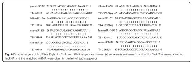 利用psRNATarget軟件及miRbase數(shù)據(jù)庫信息從DE-lincRNA中篩選miRNA的靶標(biāo),找到101個(gè)靶標(biāo)lincRNA。其中有6個(gè)miRNA被本實(shí)驗(yàn)室先前的small RNAseq 驗(yàn)證過,并且這6個(gè)miRNA是跟小麥白粉病相關(guān)的。