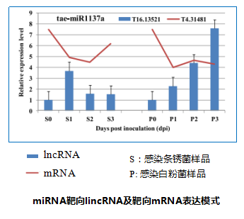 對(duì)miRNA的靶標(biāo)lincRNA和靶標(biāo)mRNA的調(diào)控作用關(guān)系進(jìn)行驗(yàn)證,發(fā)現(xiàn)經(jīng)Pst 或Bgt侵染后共同表達(dá)的lincRNA及共同表達(dá)的mRNA大都表現(xiàn)出了相反的表達(dá)模式。表明,小麥中l(wèi)inRNA可能通過與miRNA作用間接影響mRNA的表達(dá)。