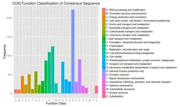2.用BLASTX將組裝得到的序列與Nr,Swiss-Prot,GO,COG和KEGG數(shù)據(jù)庫進(jìn)行比對(duì),共有8288個(gè)Unigenes注釋到了25個(gè)COG類別中的11713個(gè)功能。有585個(gè)Unigenes注釋到“碳水化合物的運(yùn)輸和代謝”。