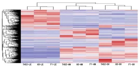 因為T452和H3的雜交F1代表現(xiàn)出了優(yōu)良性狀,因此可以通過轉(zhuǎn)錄組測序研究性狀差異的原因。取T452,H3及雜交F1代的三種不同組織分別進行轉(zhuǎn)錄組測序,包括減數(shù)分裂階段的花藥、減數(shù)分裂階段的子房、開花階段的旗葉??偣矞y了548M clean reads,平均有89.06%的reads可以比對到參考基因組上,其中93.45%都是比對到唯一位置上。三個生物學重復之間的相關性都達到了0.8以上。用qRT-PCR的方法對12個差異表達基因(DEG)的表達量進行了驗證,結果與轉(zhuǎn)錄組測序的結果一致。對不同樣品進行層次聚類分析表明,相同組織的樣品總能聚到一塊(圖2)。