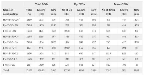 表2:三個不同組織中的差異表達基因統(tǒng)計。AN:花藥;OV:子房;LE:葉片。
