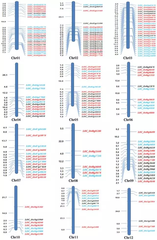 圖3:與育性和雜種優(yōu)勢相關的基因在染色體上分布。紅色為葉片中的基因,藍色為花藥中的基因,黑色為子房中的基因。
