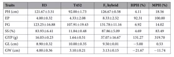 表一:T452與H3雜交F1代的雜種優(yōu)勢。HPH:高親優(yōu)勢;MPH中親優(yōu)勢;PH:植株高度;EP:單株谷粒數(shù);FG:單花谷粒數(shù);SS:結實率;GYP:單株產(chǎn)量;GL:10谷粒長度;GW:10谷粒寬度。