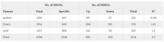 表4:非累加表達基因(NDEG)和DEGFu及不同組織的DEGFu-sp數(shù)量統(tǒng)計。星號表示NDEG在F1表達的總基因中的比例。