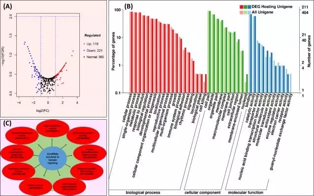 (B):基于親本基因?qū)ircRNAs進行Gene Ontology(GO)功能注釋。以biological process,molecular function和cellular component對GO terms進行大類劃分;