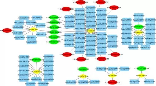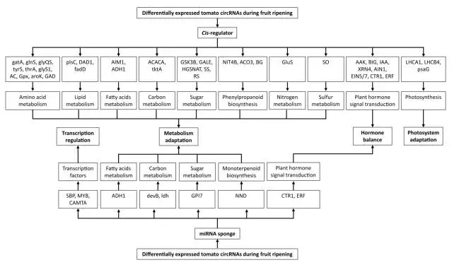 為了進一步揭示circRNA在果實成熟中的作用,我們對circRNA靶向的miRNA以及miRNA的靶標(biāo)mRNA進行了預(yù)測。結(jié)果發(fā)現(xiàn)其中20個circRNA上含有7個miRNA結(jié)合位點,同時鑒定出94個miRNA的靶標(biāo)mRNA。通過對鑒定到的94個靶標(biāo)mRNA進行GO富集和KEGG分析,總結(jié)出circRNA可能通過調(diào)節(jié)代謝過程、激素平衡以及光合相關(guān)的通路來調(diào)控番茄果實成熟。此外,circRNA還可能通過參與轉(zhuǎn)錄調(diào)控,主要是通過調(diào)節(jié)包括ERF、SBP、MYB等果實成熟相關(guān)的轉(zhuǎn)錄因子,來調(diào)節(jié)番茄果實的成熟。