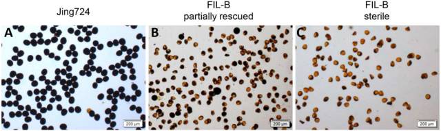 1、育性分析:FIL-B(育性不穩(wěn)定系)分為育性部分恢復的植株和完全不育植株,本項目所構(gòu)建的BC4群體462個子代中有14.9% 的植株為育性部分恢復的表型。育性部分恢復植株的花粉大小小于正常花粉,大于完全不育植株的花粉(Fig 1.)。經(jīng)I2-KI染色后的不育花粉表現(xiàn)出形態(tài)的不規(guī)則和染色的異常(Fig 2.)。