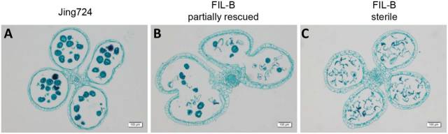 2、顯微鏡下觀察花粉小孢子:在育性部分恢復的植株中只有一部分的小孢子呈現(xiàn)在正常形態(tài),而在不育植株中無正常形態(tài)小孢子。(Fig 3.)