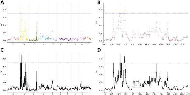 A: 各染色體上SNP的ED值; B: 2號染色體上SNP的ED值;C:各染色體上SNP經(jīng)擬合后的關(guān)聯(lián)分析結(jié)果;B: 2號染色體上SNP經(jīng)擬合后的的關(guān)聯(lián)分析結(jié)果,其中紅色的虛線代表閾值線(99百分位法計算得到),黑色的實線代表擬合曲線