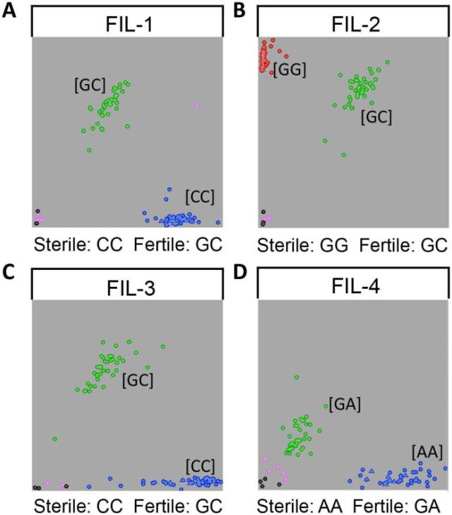 本研究選取BC4群體中50株育性部分恢復植株和50株不育植株,分別提取DNA,對候選的兩個蛋白基因共4個SNP位點進行KASP驗證,發(fā)現(xiàn)在不同的表型下會出現(xiàn)不同的基因型,再次暗示這兩個基因很可能是與育性不穩(wěn)定相關(guān)。