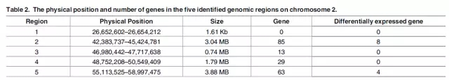 4、BSR關(guān)聯(lián)分析:與參考基因組比對后,F(xiàn)池和S池分別獲得171,594和 170,820個 SNP,選取混池間差異的SNP位點,進行ED關(guān)聯(lián)分析,共得到5個候選區(qū)域(Fig 4.),結(jié)合數(shù)據(jù)庫注釋結(jié)果及轉(zhuǎn)錄組差異基因的結(jié)果,最終獲得12個候選基因(Table 2、Table 3)。