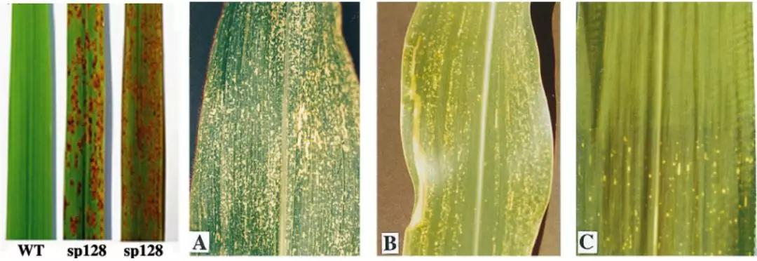 植物類病變(lesion mimic, LM)又稱類病斑,是指在沒有受到任何病原菌侵染的條件下,植物自發(fā)產(chǎn)生壞死斑點(diǎn)。這種局部細(xì)胞的壞死屬于細(xì)胞程序化死亡(PCD),細(xì)胞程序化死亡在植物生長發(fā)育過程中廣泛存在,特別是受到生物或非生物脅迫,當(dāng)受到不相容的病原菌感染時(shí),植物可以在受感染的部位啟動(dòng)某種形式的PCD,以限制病原體的傳播,這是一種先天性的免疫反應(yīng),稱為超敏反應(yīng)(HR)。HR是植物細(xì)胞為限制病原菌生長而快速死亡的一種方式,其誘導(dǎo)的細(xì)胞死亡可以激發(fā)鄰近組織的防衛(wèi)反應(yīng)(defense response)和植株的系統(tǒng)獲得性抗性(systemic acquired resistance,SAR)。