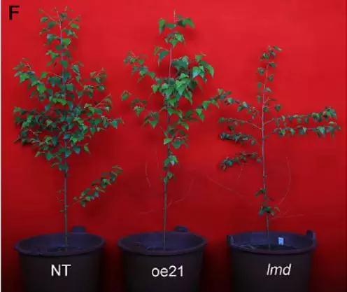 轉(zhuǎn)錄組材料為lmd、oe21、NT,lmd突變體是從BpGH3.5轉(zhuǎn)基因株系中分離出;oe21株系是正常的BpGH3.5轉(zhuǎn)基因株系;對(duì)照材料是非轉(zhuǎn)基因的NT。