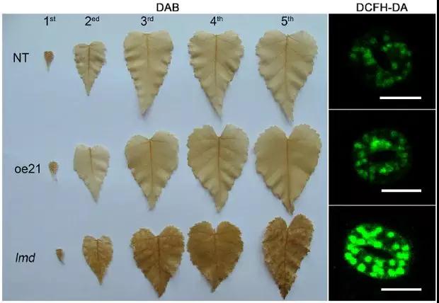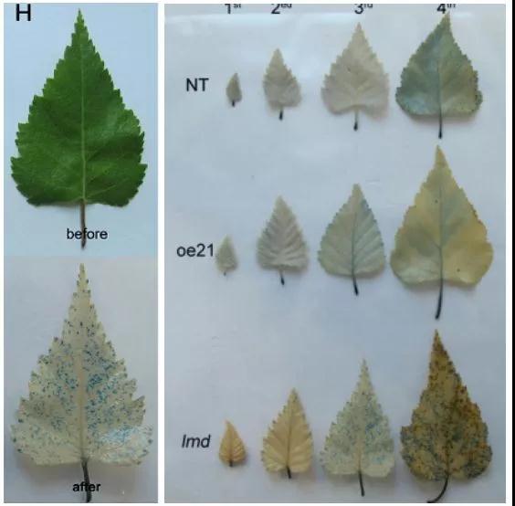 作者在研究BpGH3.5在樺樹中的功能時(shí)偶然獲得了lmd突變體。構(gòu)建的21株OE-GH3.5株系中,唯獨(dú)lmd葉片表現(xiàn)出壞死斑點(diǎn)并伴有早衰的現(xiàn)象。這很明顯是一種病變的表現(xiàn),當(dāng)這種情況出現(xiàn),很顯然我們要思考兩個(gè)問題: