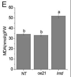 類病變突變體通常會(huì)表現(xiàn)出自發(fā)性的細(xì)胞程序性死亡(PCD),作者通過伊文思藍(lán)染色比較了lmd與NT、oe21的細(xì)胞死亡情況(圖4);丙二醛含量檢測(cè)間接反映了lmd細(xì)胞損壞程度也更高(圖5);