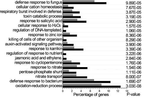 為了深入了解lmd體內(nèi)的分子水平變化,作者進(jìn)行了轉(zhuǎn)錄組測(cè)序。對(duì)差異基因進(jìn)行分析發(fā)現(xiàn)了許多與致病相關(guān)的基因,如WRKY、谷胱甘肽-轉(zhuǎn)移酶(GST)、乙烯反應(yīng)因子(ERF)和絲氨酸/蘇氨酸蛋白激酶(serine/threonine-protein kinase),這些都已經(jīng)被研究證實(shí)與防御反應(yīng)相關(guān)。GO富集分析顯示,參與催化活性、抗氧化活性、免疫系統(tǒng)過程和刺激響應(yīng)的差異基因發(fā)生了顯著富集(圖9)。