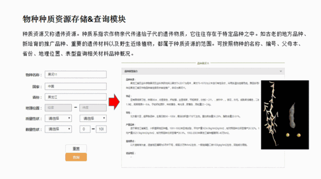 存儲&查詢模塊:設(shè)置了種質(zhì)資源、突變體信息、性狀座位信息、分子標記、基因功能信息、基因組數(shù)據(jù)、轉(zhuǎn)錄組數(shù)據(jù)的存儲和查詢。