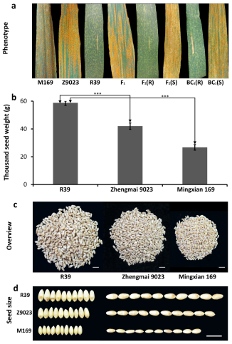 在抗性鑒定中發(fā)現(xiàn),其在幼苗期對7種病菌均呈現(xiàn)感病,而成株期均呈現(xiàn)抗?。▓D1a);而鄭麥9023和銘賢169全生育期均為感病。此外,R39的千粒重顯著高于鄭麥9023和銘賢169,這表明在條銹病發(fā)病條件下,R39的籽粒產(chǎn)量更高,種子質(zhì)量更好(圖1b-d)。