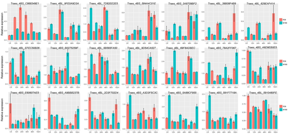 目標(biāo)區(qū)域包含126個(gè)基因(表3),通過功能注釋,找到21個(gè)與條銹病抗性相關(guān)的基因,擬定為候選基因,并進(jìn)行qRT-PCR驗(yàn)證。結(jié)果表明,在病菌接種后12、24、48和96h,只有候選基因Traes_4BS_C868349E1(注釋為F-box / LRR-重復(fù)蛋白)在R39中顯示出比在銘賢169中更高的表達(dá)水平(圖4)。 這表明其可能參與了R39對條銹病的抗性。