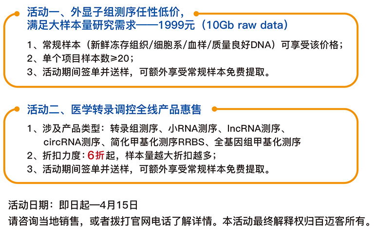 開(kāi)學(xué)季,放禮季,百邁客醫(yī)學(xué)產(chǎn)品全線促銷(xiāo)活動(dòng)開(kāi)啟。百邁客全外顯子組測(cè)序(10Gb/樣本,Q30>85%),主流外顯子捕獲平臺(tái)羅氏NimbleGen SeqCap EZ Exome Library V3和安捷倫 SureSelect Human All Exon V6,一律1999元/樣本?。ǖ饶銇?lái)償鮮)
