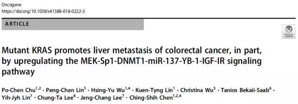 3月21日,Nature旗下癌癥雜志Oncogene在線發(fā)表了來自臺灣中央研究院生物化學(xué)研究所等機(jī)構(gòu)的一項(xiàng)研究成果。該研究發(fā)現(xiàn),KRAS基因突變通過上調(diào)MEK—Sp1K—DNMT1K—miR-137K—YB-1K—IGF-IR信號通路促進(jìn)結(jié)直腸癌的肝轉(zhuǎn)移。這為MEK抑制劑作為輔助藥物與標(biāo)準(zhǔn)治療藥物聯(lián)合使用,防止KRAS突變的CRC患者在接受肝臟切除手術(shù)之后復(fù)發(fā),提供了理論支持。
