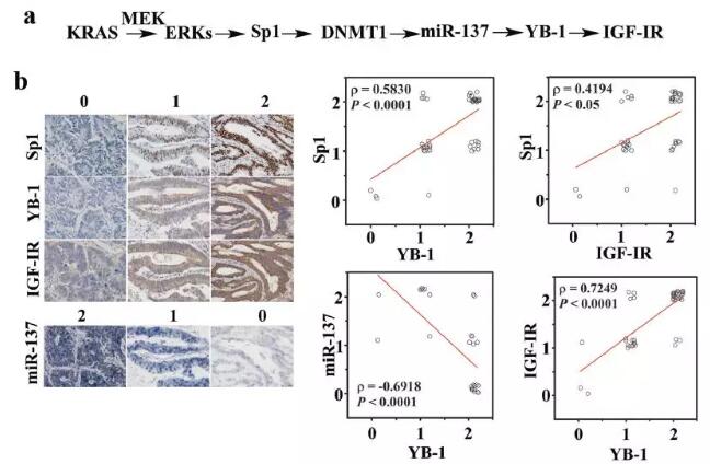 盡管我們都知道胰島素樣生長因子I受體(IGF-IR)能夠促進(jìn)結(jié)直腸癌的肝轉(zhuǎn)移,但是并不清楚腫瘤是通過哪種機(jī)制上調(diào)IGF-IR表達(dá)。研究發(fā)現(xiàn)在結(jié)直腸癌細(xì)胞中,KRAS突變體通過MEK—Sp1—DNMT1—miR-137信號通路上調(diào)Y-box結(jié)合蛋白1 (YB-1),進(jìn)而轉(zhuǎn)錄激活I(lǐng)GF-IR基因表達(dá)。后續(xù)46例KRAS突變的CRC患者肝轉(zhuǎn)移免疫組織化學(xué)評估試驗(yàn)也進(jìn)一步證實(shí)這一發(fā)現(xiàn),Sp1、 miR-137、YB-1和IGF-1R之間的表達(dá)顯著相關(guān)。在動物模型中,通過基因敲減或MEK藥物抑制下調(diào)YB-1和IGF-IR的表達(dá),可阻止KRAS突變的結(jié)直腸癌肝轉(zhuǎn)移。