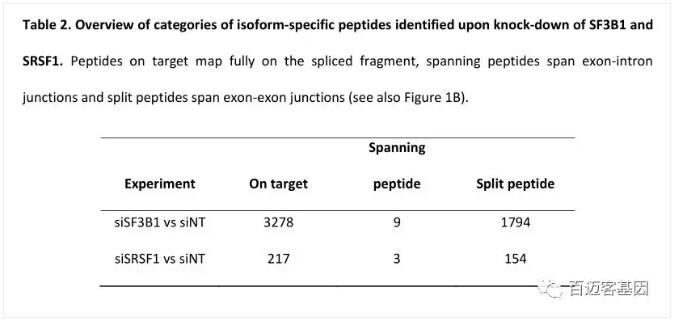 肽段數(shù)量上的差別直接和兩個(gè)實(shí)驗(yàn)剪接isoform數(shù)據(jù)庫(kù)的數(shù)目相關(guān)??偟膩碚f,大約60%的isoform特異肽段會(huì)比對(duì)到目標(biāo)區(qū)域,跨越exon-econ junction的split 肽段約占40%,跨越 exon-intron junctions 的spanning肽段則很少被發(fā)現(xiàn)(如表2所示)。