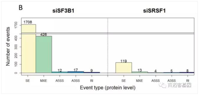 轉(zhuǎn)錄組分析顯示siSF3B1和siSRSF1的可變剪接事件與對(duì)照組相比有顯著差異(圖3A),證明對(duì)剪接因子的操作導(dǎo)致了差異剪接的產(chǎn)生。