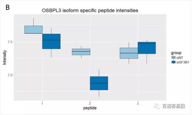 約65%的顯著差異表達(dá)的splice-specific-peptides在RNA水平上表現(xiàn)出一致的表達(dá)差異。例如,下調(diào)SF3B1的實(shí)驗(yàn)組中,OSBPL3 9號(hào)外顯子中分別有3個(gè)支持外顯子保留和1個(gè)支持外顯子去除的peptides被鑒定出來。兩種inclusion specific-peptides表達(dá)明顯較低,而exclusion specific -peptides則與對(duì)照相比表現(xiàn)出較高的表達(dá)量(如圖5所示)。