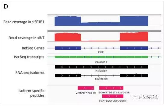 例如,全長(zhǎng)轉(zhuǎn)錄本進(jìn)行測(cè)序結(jié)果支持FXR1內(nèi)含子保留的三種肽段,因此這種內(nèi)含子保留事件也存在于注釋文件中。Illumina 測(cè)到的短 reads支持這一事件,并提供了定量的證據(jù),表明它在SF3B1的下調(diào)過程中比其對(duì)照組(圖6D)更高表達(dá)。