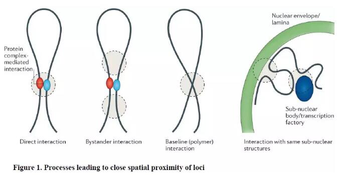 這些3C及其衍生技術(shù)報(bào)告了細(xì)胞群體中兩個(gè)基因座空間上緊密接近的頻率,但未區(qū)分功能性與非功能性的位點(diǎn)間關(guān)聯(lián),也未揭示導(dǎo)致其共定位的機(jī)制。空間上緊密接近包括以下幾種情況:1)Direct interaction:兩個(gè)基因座之間直接、特異性接觸的結(jié)果(由結(jié)合它們的蛋白質(zhì)復(fù)合物介導(dǎo));2)Interaction with the same sub-nuclear structures:成對(duì)基因座與相同亞核結(jié)構(gòu)間接共定位的結(jié)果(例如核纖層,核仁、或轉(zhuǎn)錄工廠等)。3)Bystander interaction:在某些細(xì)胞中,由于鄰近的某些遠(yuǎn)程互作或其他約束因素決定的染色質(zhì)纖維的堆積和折疊的造成的非特異性接觸,或者由于擁擠核中的隨機(jī)(非特異性)碰撞導(dǎo)致的非特異性接觸。4)Baseline(polymer) interaction:染色質(zhì)纖維非常長(zhǎng),而且柔韌,染色體具有聚合體性質(zhì),因此,即使在沒(méi)有任何特定高階結(jié)構(gòu)的情況下,這個(gè)特征在很大程度上也決定了基因座間相互作用的頻率。