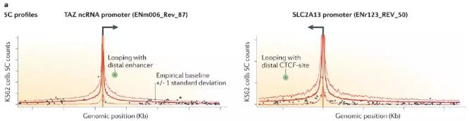 盡管5C技術(shù)存在上述缺陷,但仍舊揭示了染色質(zhì)不同區(qū)域間遠(yuǎn)程互作參與基因表達(dá)調(diào)控的普遍規(guī)律。Sanyal等人發(fā)現(xiàn)了基因啟動(dòng)子和遠(yuǎn)端基因座之間有數(shù)千個(gè)重要的遠(yuǎn)距離loop互作,強(qiáng)調(diào)了許多基因啟動(dòng)子通過(guò)染色質(zhì)環(huán)與遠(yuǎn)端元件互作的觀點(diǎn)。普遍規(guī)律如下:1)許多染色質(zhì)成環(huán)事件是活性基因啟動(dòng)子和類(lèi)似于活性增強(qiáng)子的遠(yuǎn)端元件之間的細(xì)胞類(lèi)型特異性互作,這與這些染色體結(jié)構(gòu)在基因活化中的作用一致;2)其中一類(lèi)豐富的遠(yuǎn)程互作即是啟動(dòng)子區(qū)與絕緣蛋白CTCF結(jié)合位點(diǎn)之間成環(huán);3)通常認(rèn)為調(diào)控元件可以調(diào)節(jié)*鄰近的基因,但是成環(huán)互作經(jīng)常跳過(guò)一個(gè)或多個(gè)基因,這表明基因和元件的線性排列是它們之間功能和結(jié)構(gòu)互作的較差預(yù)測(cè)因子;4)基因和調(diào)控元件之間的關(guān)系并不唯一:一個(gè)基因可以與多個(gè)遠(yuǎn)端元件互作,同時(shí)一個(gè)元件也可以與多個(gè)基因互作。
