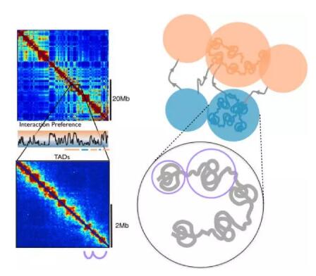 哺乳動(dòng)物基因組的染色體內(nèi)和染色體間相互作用圖揭示了一種相互作用模式,可以近似分為兩個(gè)隔間(A和B,或稱(chēng)區(qū)室/隔室),它們沿著染色體交替,并且具有約5Mb的特征尺寸。A隔間優(yōu)先與整個(gè)基因組中的其它A隔間相互作用。 同樣,B隔間與其它B隔間相關(guān)聯(lián)。隔間信號(hào)可以通過(guò)互作圖的特征向量擴(kuò)展來(lái)量化。 A / B室信號(hào)不是簡(jiǎn)單的雙相(僅代表兩種狀態(tài)),而是連續(xù)的,并且與轉(zhuǎn)錄活性指標(biāo),如DNA可及性、基因密度、復(fù)制時(shí)間、GC含量和幾個(gè)組蛋白標(biāo)記相關(guān)。A-隔間主要是常染色質(zhì)-轉(zhuǎn)錄活躍區(qū)域,B-隔間則主要是聚集在一起的異染色質(zhì)(轉(zhuǎn)錄失活區(qū)域)。