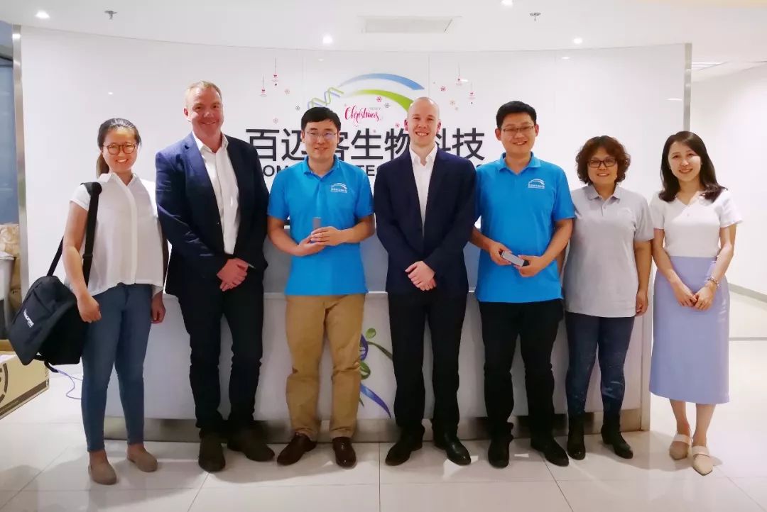 百邁客與Oxford Nanopore 商業(yè)運營副總裁Richard ,中國區(qū)商務負責人Thomas及技術支持Lin與Eva一行合影