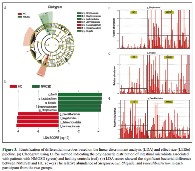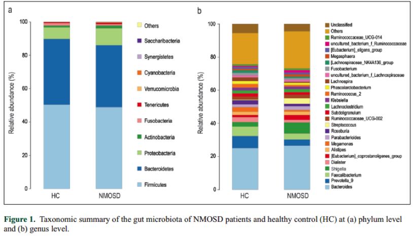 視神經(jīng)脊髓炎譜系疾病NMOSD)是一種中樞神經(jīng)系統(tǒng)(CNS)的炎癥性自身免疫疾病,是視神經(jīng)和脊髓同時或相繼受累的急性或亞急性脫髓鞘病變。視神經(jīng)脊髓炎譜系疾病具有高復(fù)發(fā)和高致殘性,具有人種差異和性別差異(男女患病比例為1:10),通常與其他自身免疫疾病(如系統(tǒng)性紅斑狼瘡、橋本氏病等)共病。長期以來,NMOSD可通過免疫學(xué)標(biāo)記(如水通道蛋白-4抗體,AQP4-IgG)或遺傳基因標(biāo)記(如人類白細(xì)胞抗原,HLA)鑒定,與幽門螺桿菌等病原相關(guān)的抗體在NMOSD患者的腸胃中也被普遍發(fā)現(xiàn)。NMOSD患者腸道微生物的研究目前仍較少,本文采用高通量測序(NGS)和氣相色譜(GC)技術(shù),分析了NMOSD患者的腸道微生物與短鏈脂肪酸(SCFAs)變化情況。