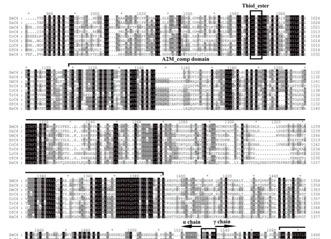 多重序列比對表明,硬骨魚和人的氨基酸高度保守。推導(dǎo)出的S.m-C4蛋白具有α-β連接子序列RXXR(在殘基668-671)和α-γ。連接序列RRXR(殘基1426-1429),其中C4氨基酸鏈被切割成三個鏈(α,β和γ鏈)。此外,保守的硫酯(GCGEQ)位點也定位在殘基1001至1005(圖5)。預(yù)測了TLR5由前21個氨基酸組成的信號肽和由14個氨基酸組成的跨膜螺旋。在膜結(jié)合型TLR5的LRR-CT中發(fā)現(xiàn)4個保守的半胱氨酸殘基,此外,還有9個蛋白結(jié)合區(qū)。結(jié)果表明,S.m-TLR5蛋白與銀大麻哈魚(91.5%)、大西洋鮭(91.7%)和衰白鮭(89.6%)的同源性較高,與鯉魚(48.1%)和金鯽(48.8%)的同源性較低。