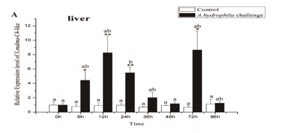 為探討這兩種免疫基因在細(xì)菌侵入的免疫應(yīng)答,采用定量實時PCR(qPCR)技術(shù),觀察注射后96h內(nèi)肝、脾臟相關(guān)基因的表達(dá)。對于鹽水處理組,即對照組,S.m-C4基因在研究的所有時間點肝臟中均無顯著差異(圖9)。對于嗜水氣單胞菌注射組,即實驗組,肝臟在24小時有顯著增加(p=0.04),在12小時和72小時出現(xiàn)兩個峰值,邊緣顯著。在6h、12h、24h和72h,實驗組與對照組有顯著性差異。對照組脾臟中S.m-C4基因的相對表達(dá)上下波動,8個時間點之間差異不顯著,實驗組脾臟中S.m-C4基因的相對表達(dá)除72h外,其余時間點均無差異,與細(xì)菌注射組0 h相比減少59.6%。