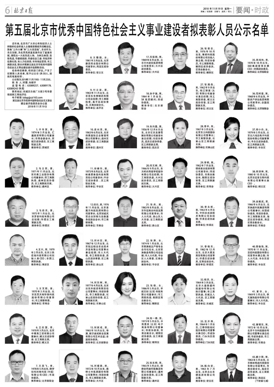 2018年11月19日,由市委統(tǒng)戰(zhàn)部、市委社會(huì)工委、市經(jīng)濟(jì)和信息化局、市人力社保局、市市場監(jiān)管局、市工商聯(lián)聯(lián)合評定的50位表彰人員在北京日報(bào)公布。百邁客董事長兼CEO鄭洪坤當(dāng)選第五屆北京市優(yōu)秀中國特色社會(huì)主義事業(yè)建設(shè)者。百邁客董事長兼CEO鄭洪坤為北京市的經(jīng)濟(jì)發(fā)展,作出了重大貢獻(xiàn)。
