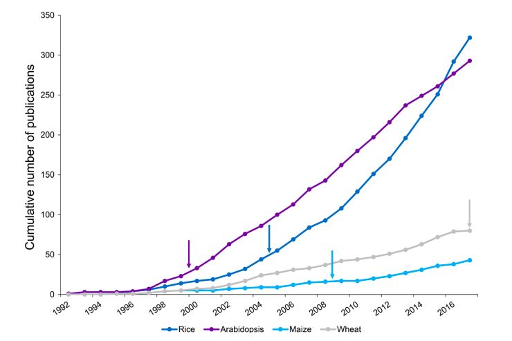 ATCG不規(guī)則的排列組合組成了地球上近870萬(wàn)個(gè)物種形形色色的遺傳物質(zhì),而解密其內(nèi)在調(diào)控機(jī)制是生物工作者心心念念?yuàn)^斗的目標(biāo)。1977年,噬菌體ΦX174長(zhǎng)達(dá)5375-bp基因組被測(cè)序完成,基因組測(cè)序事業(yè)開(kāi)始蓬勃發(fā)展,時(shí)至今日,NCBI收錄了超過(guò)6000個(gè)真核生物和150,000個(gè)原核生物的測(cè)序數(shù)據(jù),其中包括禾本科。而基因組研究目的也從單純的科學(xué)研究向?qū)嵺`應(yīng)用發(fā)生著轉(zhuǎn)換?;蚪M學(xué)和生物技術(shù)相結(jié)合,包括標(biāo)記輔助選擇,基因組選擇和基因編輯,已成為育種中不可缺少的工具,功能基因的定位和克隆將會(huì)把這種技術(shù)的結(jié)合作用發(fā)揮更大。